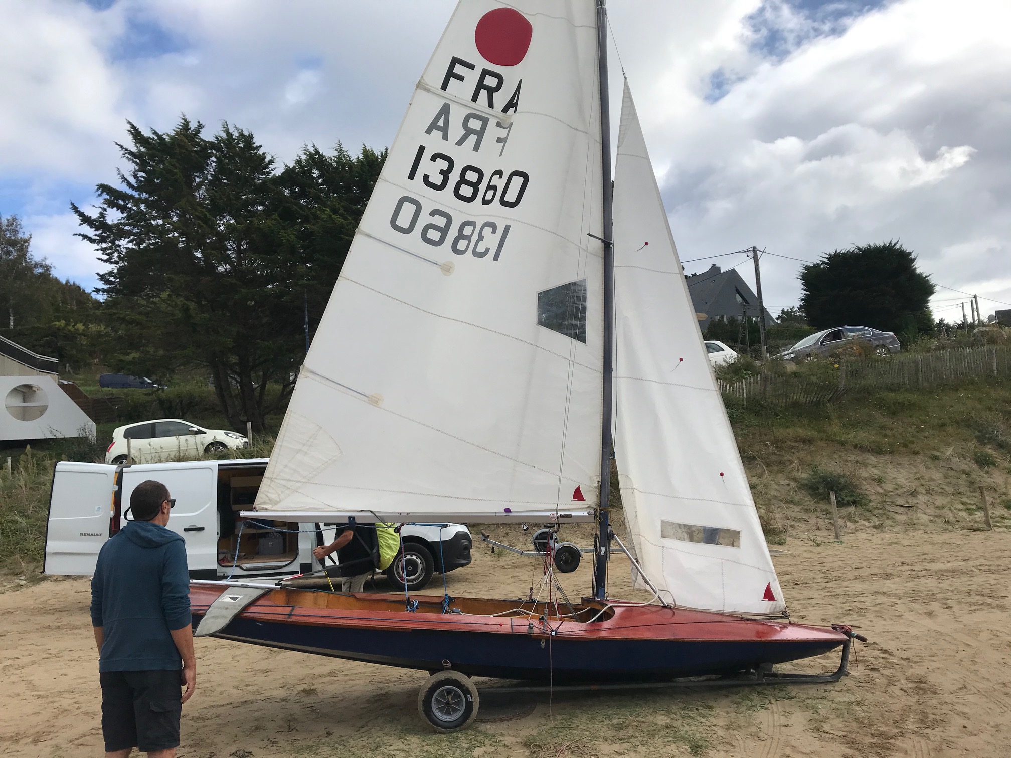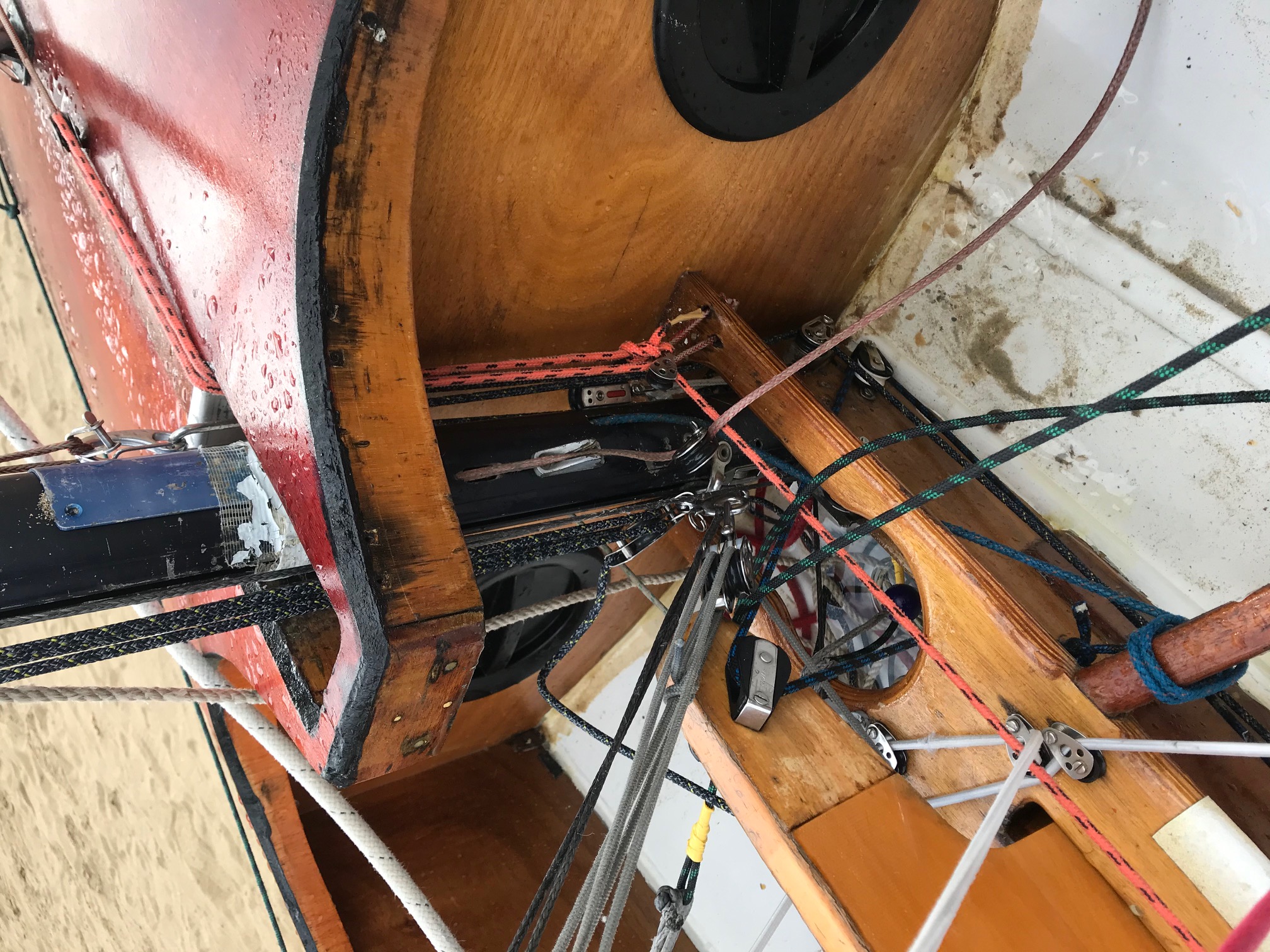 -la béquille, sur mes premières sorties j'ai monté un palan qui a l'aide d'une poulie tire vers le haut du mât. A l'inverse sur ma dernière j'ai essayé l'inverse une prise en directe du palan et qui tire vers le bas. La deuxième solution me semble plus adapter à contrer l'effort bôme plus hale-bas.